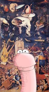 Notice how the eye is led astray by the sheer complexity of this painting. It is only by careful detective work that the viewer is able to discern the wily Mr. Dildo hidden amongst this flurry of fantastical characters.