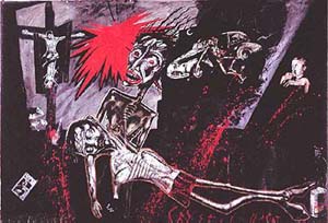 Sue Coe's painting, "Paint Thinner", depicts two Calvin Klein models. One has fainted from a combination of